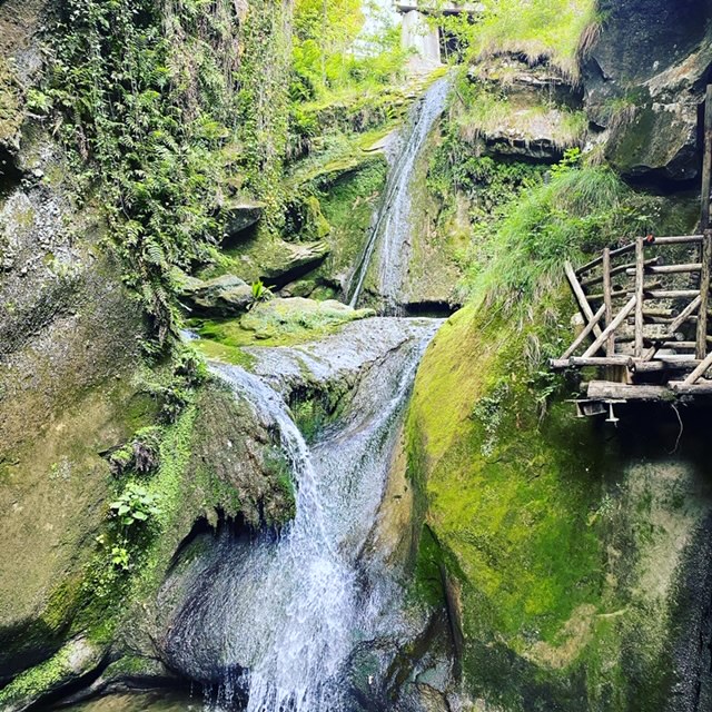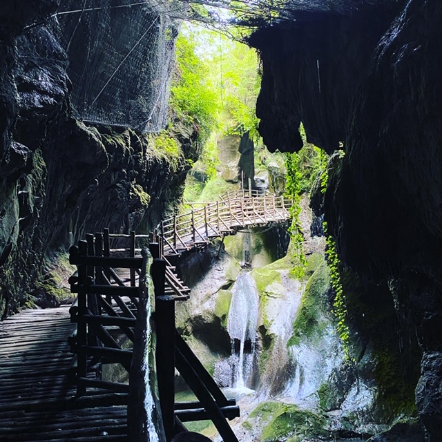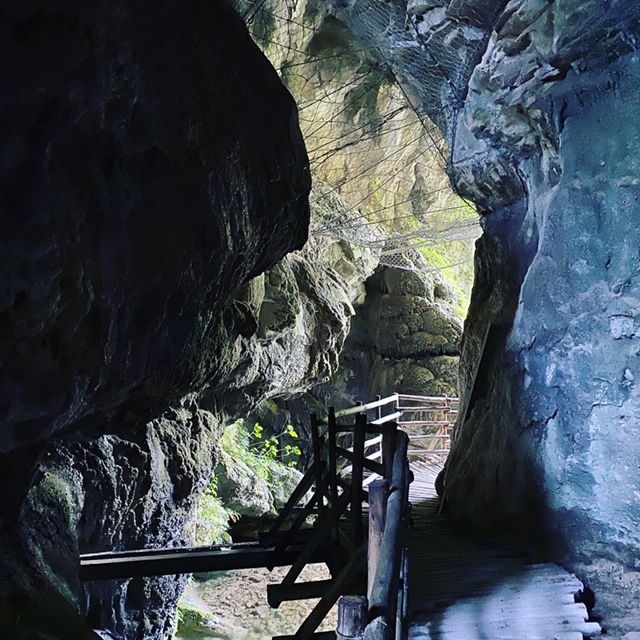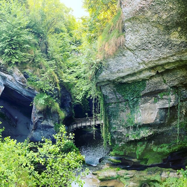 Alcune passerelle in legno permettono di esplorare lo scenario circostante e l’itinerario, ad anello, permette di vedere cascate, stalattiti e stalagmiti e di terminare il percorso in un’area di sosta con mulino e ristorante.