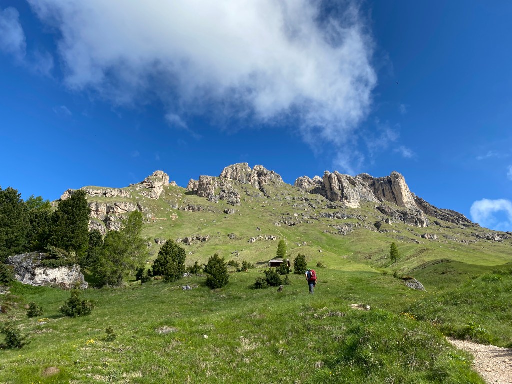La via continua in salita fino alla Forcella de Putia per poi scendere repentinamente su sentiero sassoso (e, a giugno inoltrato, ancora pieno di neve). Una volta persa quota e ricominciato leggermente a risalire, il sentiero si snoda in falsopiano attorno al Sass permettendo di ammirarlo a tutto tondo in tutta la sua maestosità.