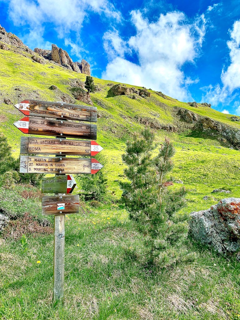 Il percorso continua poi, tra salite e discese, tra fondo sassoso, coperto di radici e ghiaino con prati accanto, fino alla successiva forcella (Forcella Göma) dalla quale si imbocca la via per la discesa al paese di Longiarù ed alla nostra partenza, il parcheggio in zona Seres-Miscì.
