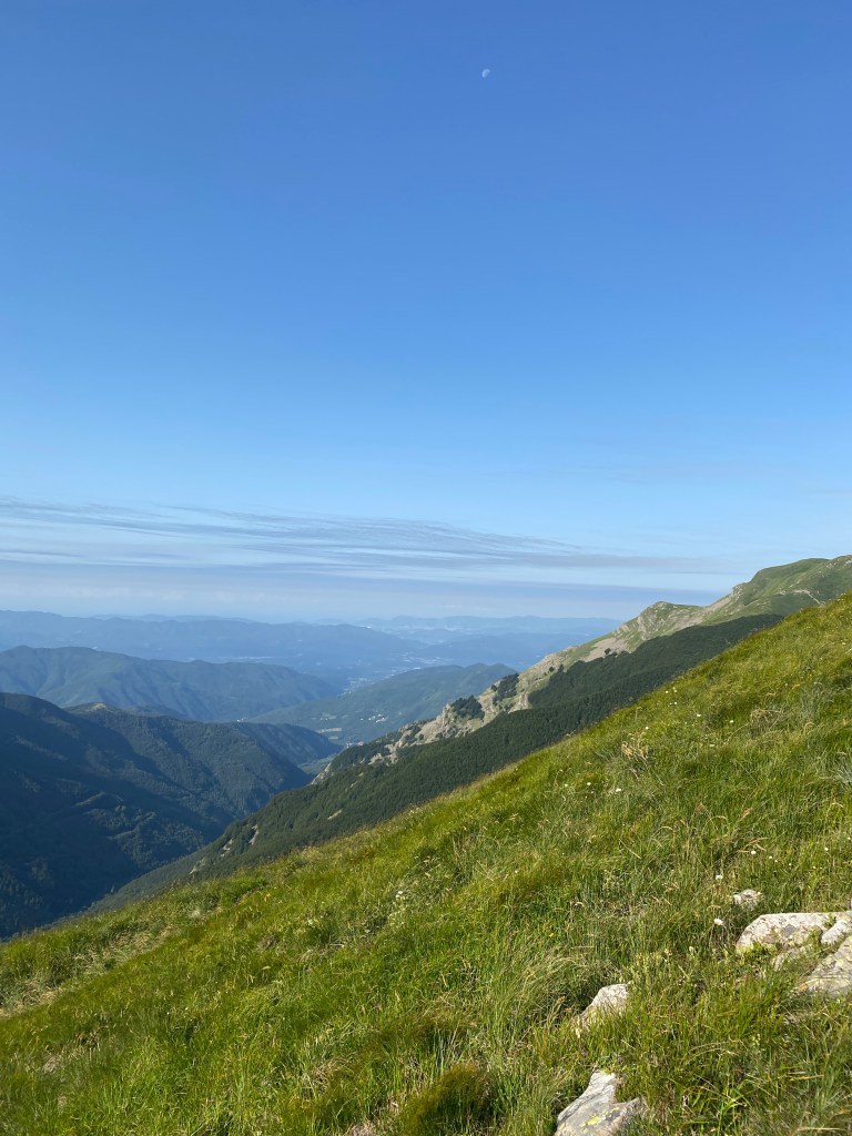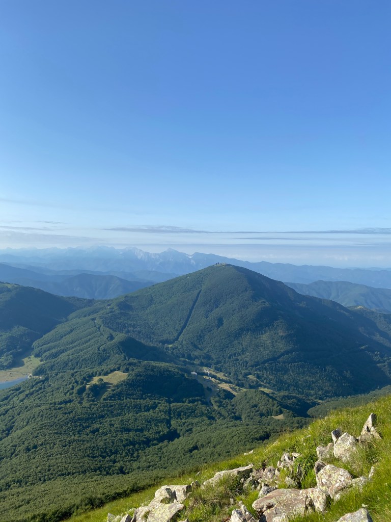 La vista, una volta sulle vette dei monti è davvero meravigliosa: da un lato si vedono gli Appennini e dall’altro, all’orizzonte, il Mar Ligure.