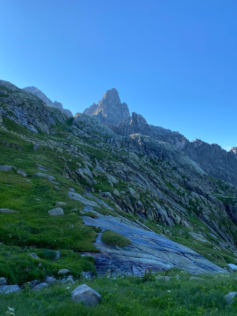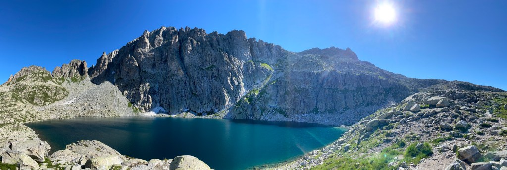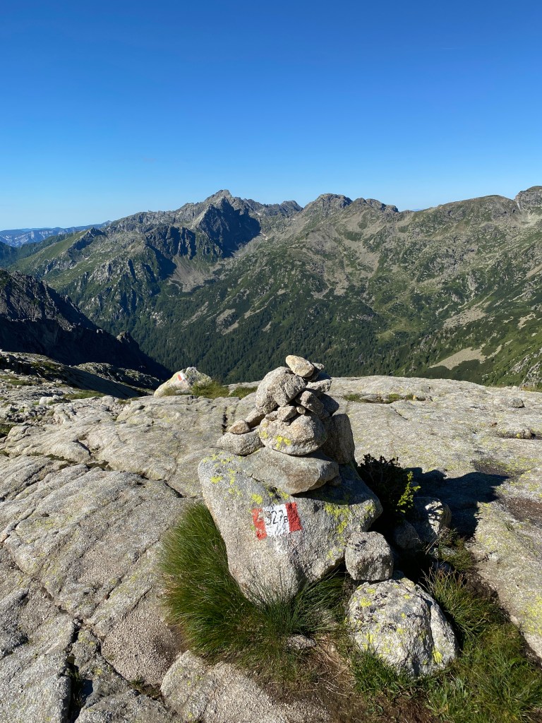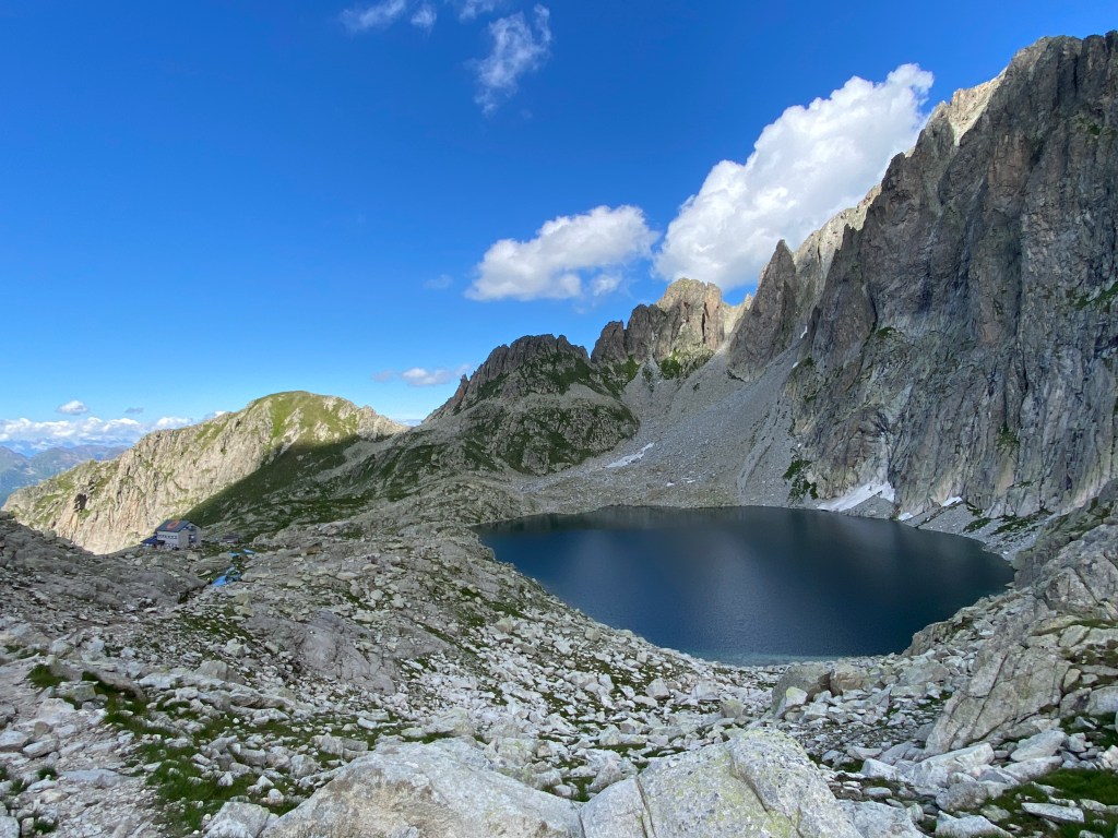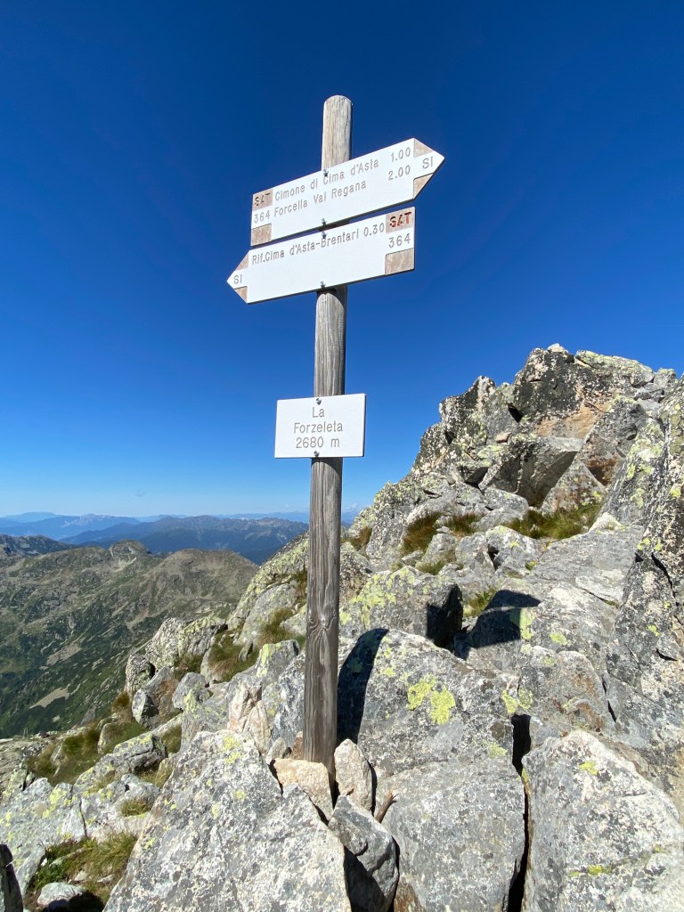 Oltrepassando il rifugio e prendendo la via per la vera e propria vetta, ci siamo fermati alla forcella. Il panorama dalla forcella “La Forzeleta”, a 2660 m s.l.m, è spettacolare: si possono ammirare dall’alto il rifugio Brentari, il Lago di Cima d’Asta e tutte le catene montuose che si stagliano contro l’azzurro del cielo.