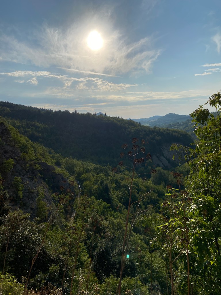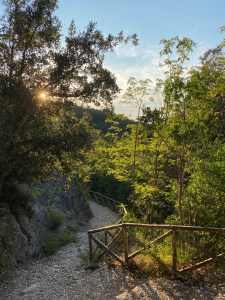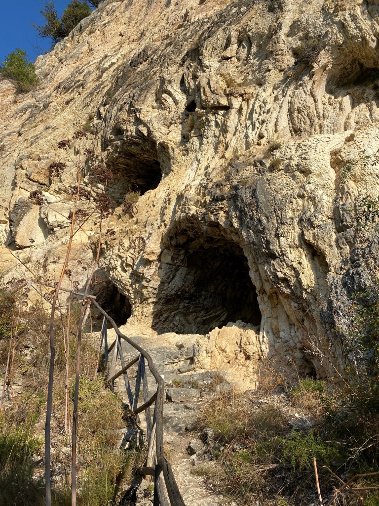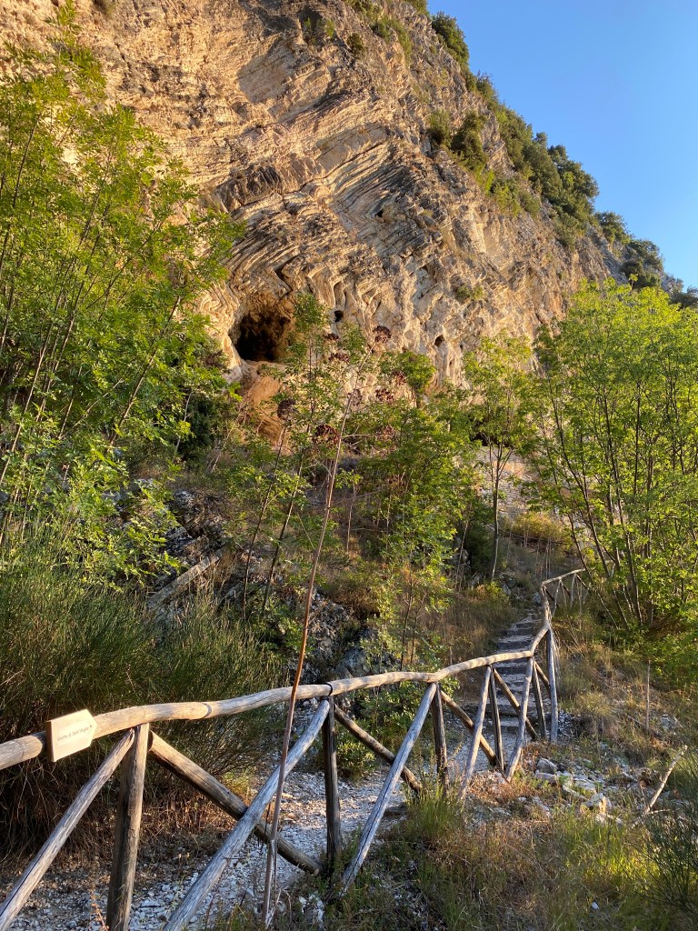 La vegetazione rinfresca il cammino e, incastonata nella roccia, si può ammirare anche una grotta abitata in passato dagli eremiti.