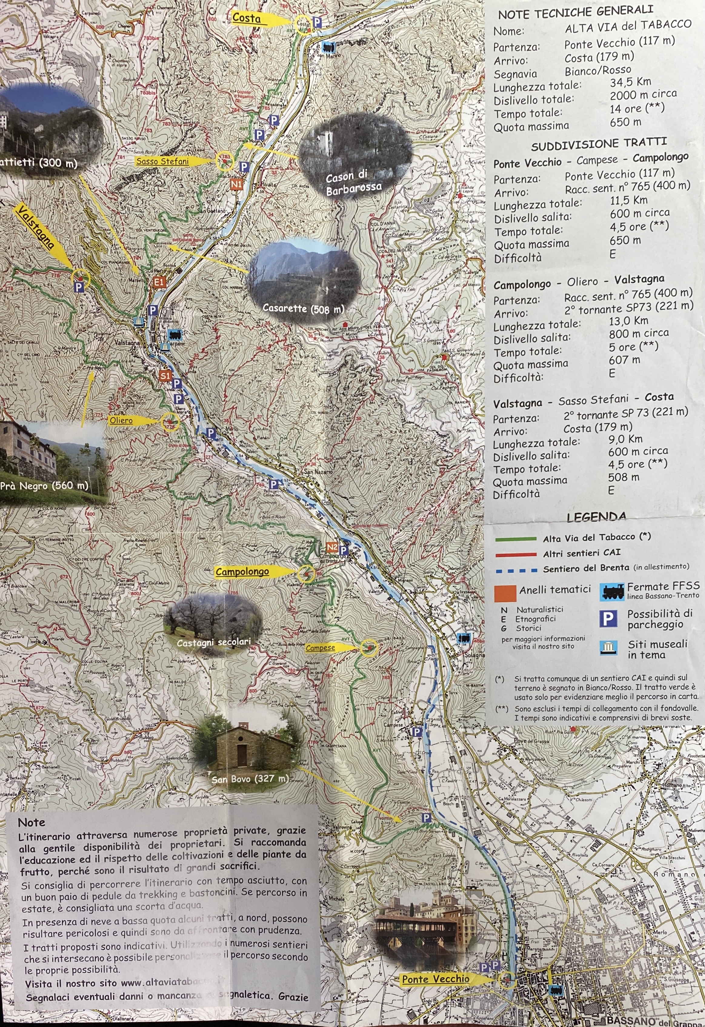 Il sentiero dell’Alta Via del Tabacco parte dal Ponte Vecchio di Bassano del Grappa ed arriva fino a Costa, oltre Valstagna, lungo il fianco destro orografico della Valbrenta, per un totale di 68 km (sola andata).