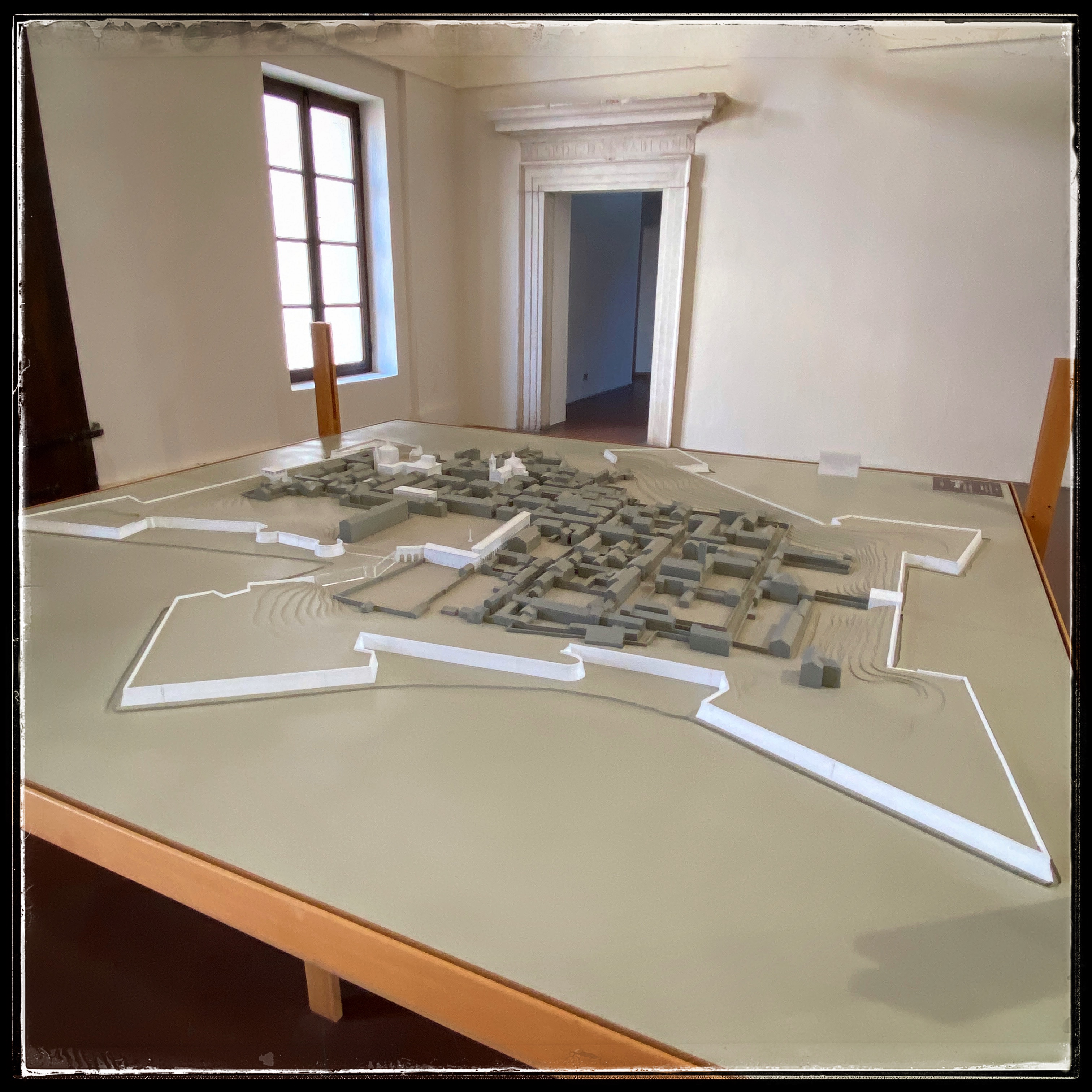 La cittadina con le sue mura perimetrali si presenta, dall’alto, come una fortezza a forma di stella.