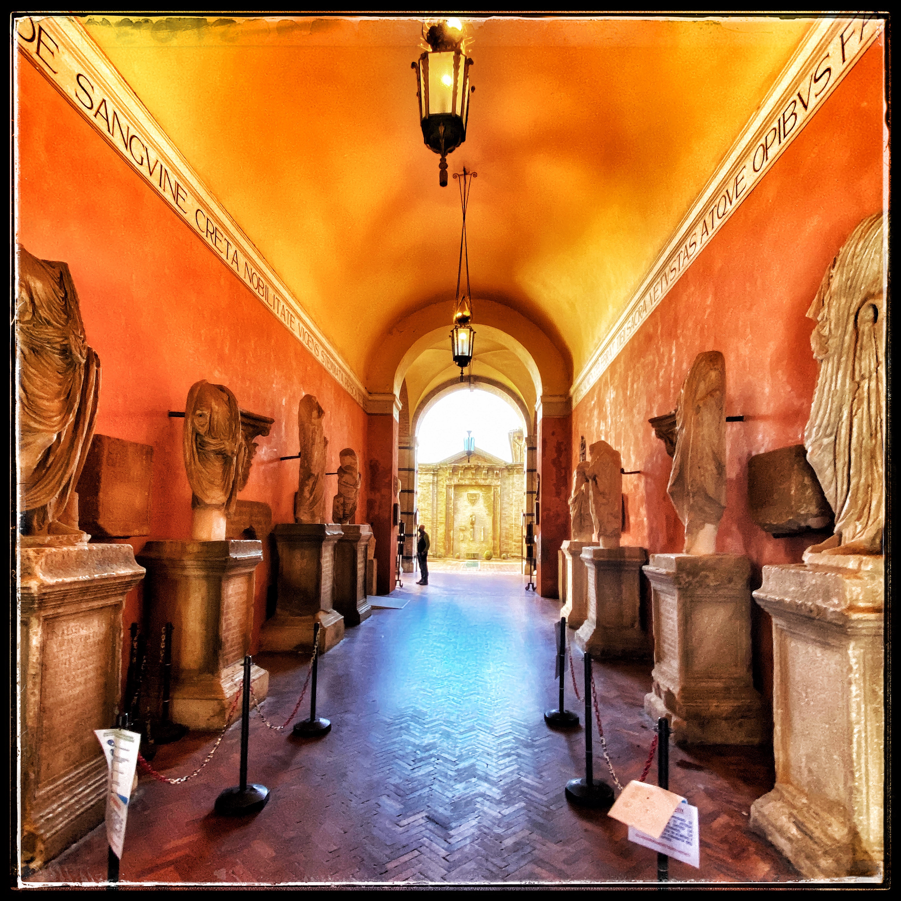 Pare che a queste 12 statue romane sia stata tagliata la testa nel 1487, quando Boccolino da Guzzone, capitano di ventura osimano, voleva diventare il signore di Osimo ma non vi riuscì. Per questo motivo il condottiero milanese Giangiacomo Trivulzio, parteggiando per le truppe pontificie, decise di tagliare tutte le teste delle statue come segno di sfregio verso la città e i suoi cittadini.
