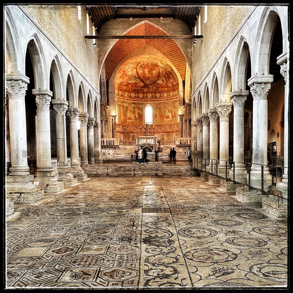 La basilica patriarcale è il monumento cristiano più importante di Aquileia e fondata poco dopo il 313 d.C. ad opera del vescovo Teodoro. Il pavimento musivo, 760 metri quadrati di meraviglioso mosaico perfettamente conservato (scoperto nei primi del novecento durante l’effettuazione dei lavori per drenare l’acqua), è una delle testimonianze più grandi dell’Occidente romano. Nella cripta sottostante è possibile vedere affreschi risalenti al XII secolo che illustrano la leggenda collegata all’evangelista Marco.