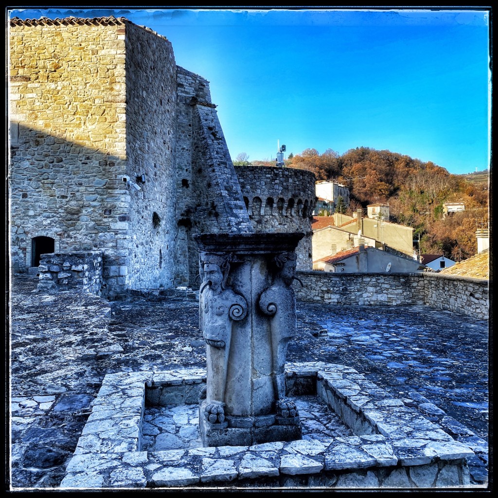 Poco lontano si trova un pozzo per la raccolta dell’acqua piovana, collegato a una cisterna della capacità di 120000 litri che in passato approvvigionava tutto il paese. Una piccola scalinata scoperta conduce al primo piano con le sale nobili e ambienti di servizio che in parte mantengono la decorazione pittorica. Nei piani inferiori trovavano posto le scuderie, i magazzini, il granaio e da qui si aveva accesso alle torri e ai cammini di ronda. Sotto la torre maggiore una scalinata interna portava al fossato e alle prigioni. Nel corso dei secoli il monumento ha subito diversi interventi: il riempimento del fossato, il crollo di parte del lato settentrionale, le modifiche agli spazi interni; ciononostante mantiene intatto il suo fascino di “antico gigante” in perfetta armonia con il centro storico e il paesaggio circostante.
